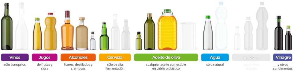 Botellas utilizables Cualquier botella de vidrio o PET cilíndrica, cuadrada o con forma